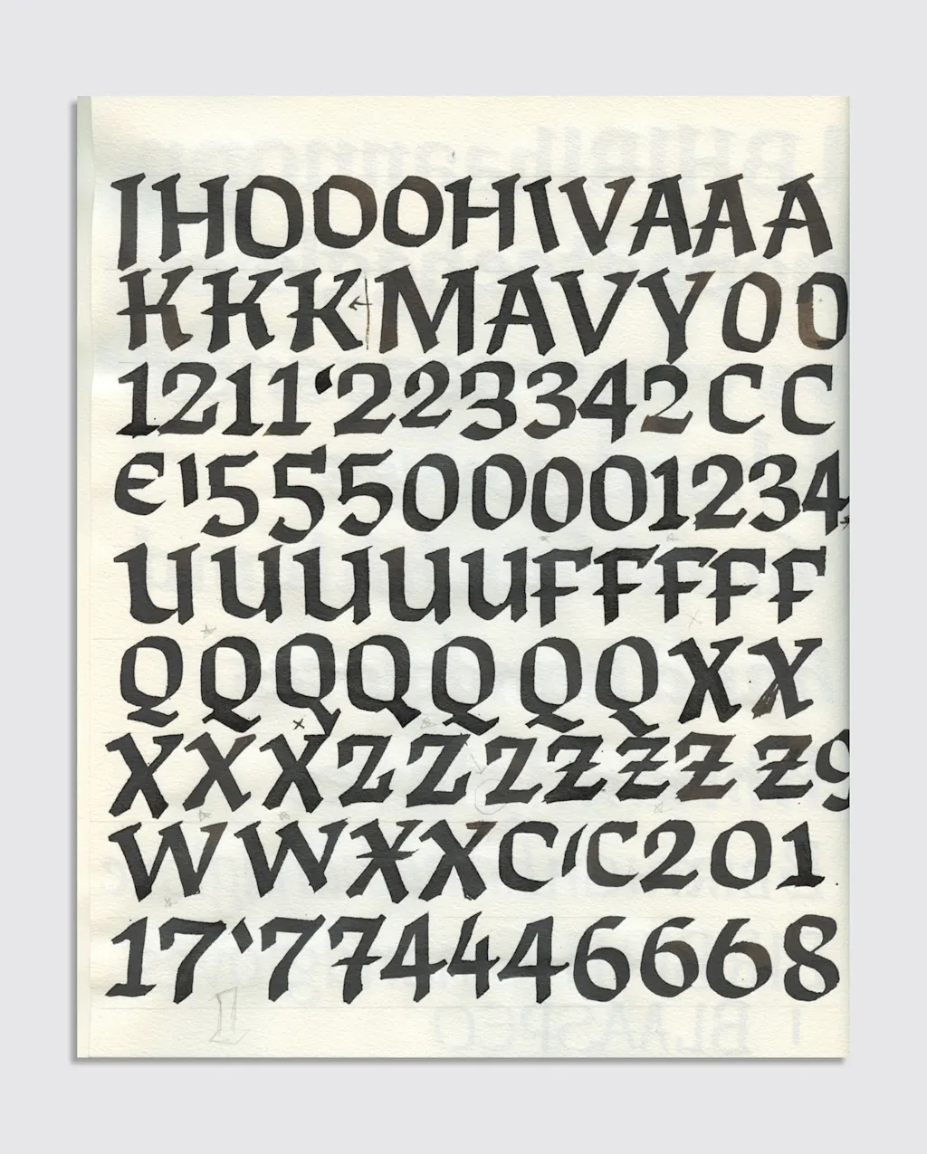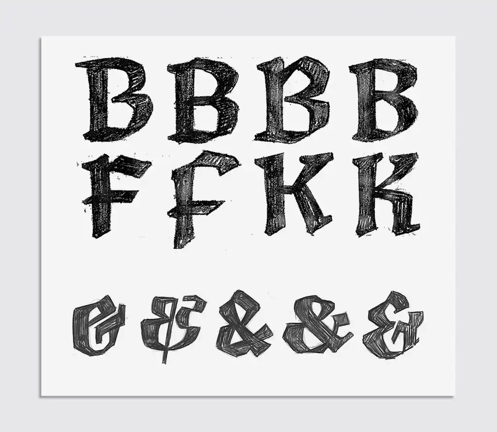 She started by writing letters over and over with a calligraphy marker, then moved to a square brush and ink to explore how expressive the forms could get without losing legibility. The result is a bold, dramatic typeface with voluptuous curves and expressive, sculptural forms designed to command attention.